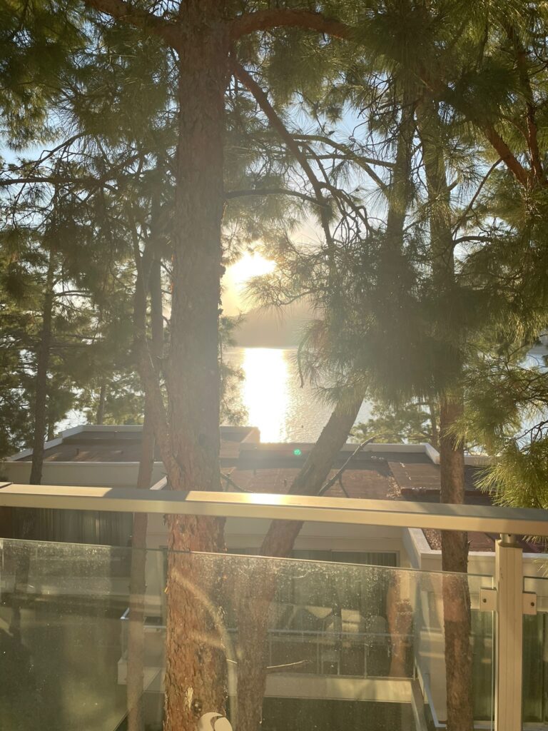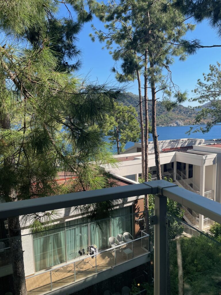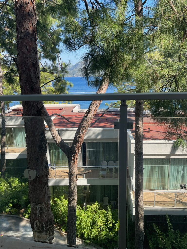 Hotel znajduje się bezpośrednio nad morzem, z własną plażą i molem. Otacza go sosnowy las – charakterystyczny zapach igliwia czuć praktycznie wszędzie. To naprawdę świetne połączenie – błękit Morza Egejskiego i cień drzew.