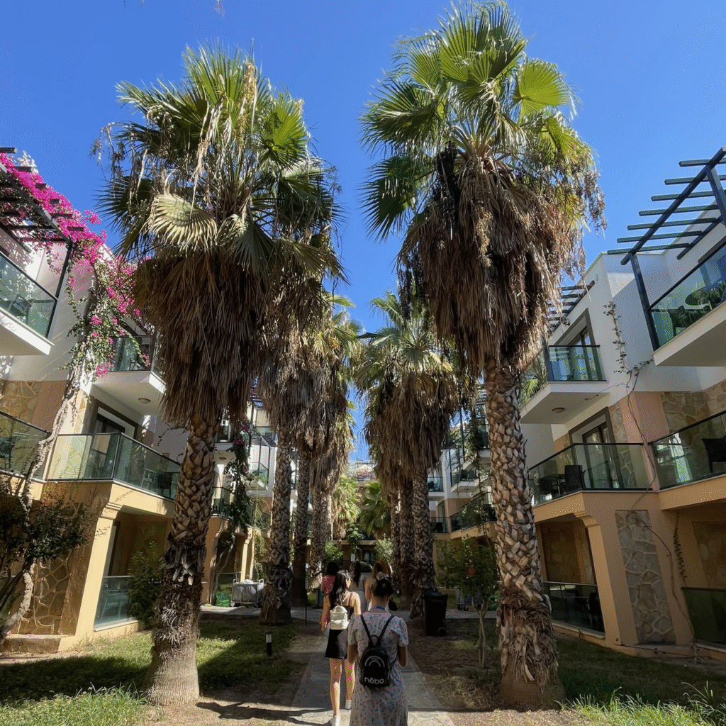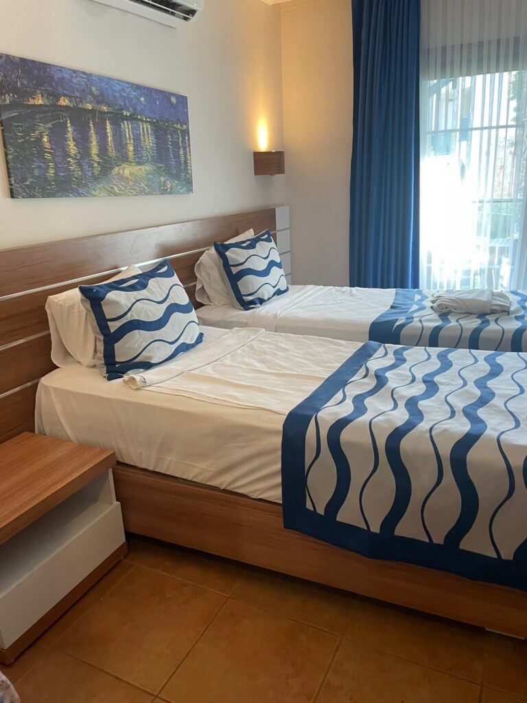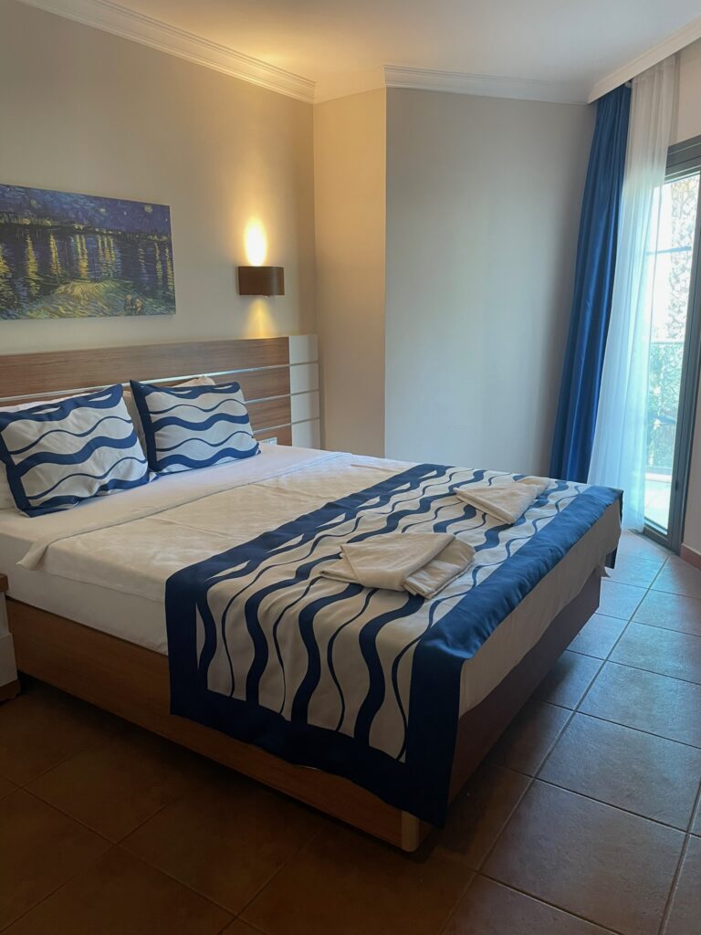 Hotel znajduje się w Gümbet, popularnej dzielnicy Bodrum znanej z szerokiej plaży i klubów. Do centrum Bodrum jest tylko 2–3 km, więc wieczorne wypady na spacer do portu czy do restauracji są bardzo łatwe. Lotnisko Milas-Bodrum oddalone jest o około 35 km. Największym atutem lokalizacji jest fakt, że do plaży masz zaledwie 20 metrów – niektóre pokoje wychodzą praktycznie prosto nad morze.